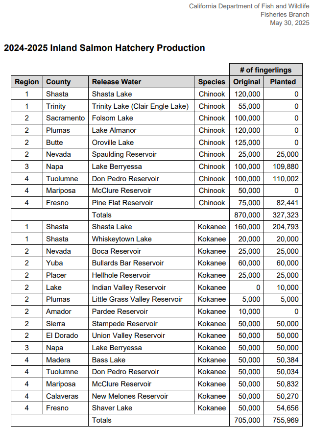 Below is the data furnished to CIFFI by the California Department of Fish & Wildlife showing Kokanee and Chinook Salmon plants within the State of California.